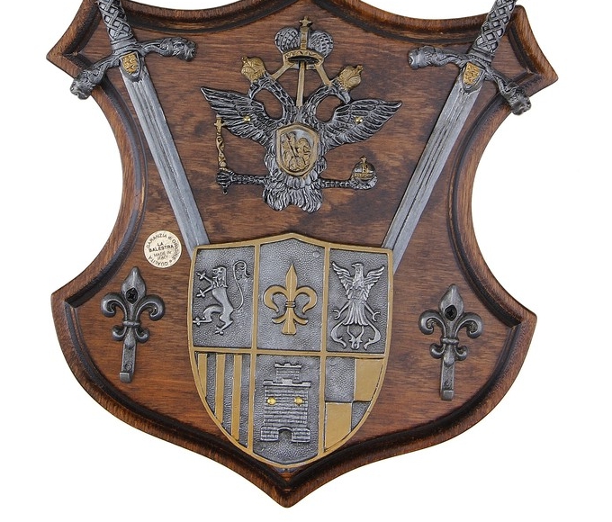 Прекрасный вариант подарка для тех, кому нравится ощущать невидимую ниточку, связывающую сегодняшний день с давно минувшими эпохами величественных каменных замков, продолжительных конных походов и будоражащих воображение легенд. Два клинка, герб и двуглавый орел составляют величественную композицию, которая, без сомнения, станет одним из самых выразительных штрихов вашего дома.