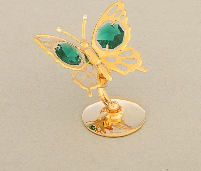 Сувенир Бабочка на подставке с 2 зелеными хрусталиками 5,5*4*6см — прекрасный выбор для тех, кто хочет сделать запоминающийся презент родным и близким. Поможет создать атмосферу праздника. Такой подарок запомнится надолго. В нём прекрасно сочетаются цена и качество. И главное, это абсолютно уникальный товар, который вы можете купить оптом по самой привлекательной цене.